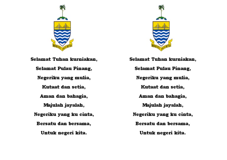 Related : Lagu Negeri Pulau Pinang / Portal Rasmi Kerajaan Negeri Pulau Pinang Lambang Bendera Lagu - Selamat tuhan kurniakan selamat pulau pinang negeri ku yang mulia ku taat dan setia aman dan bahagia majulah, jayalah negeri ku yang ku cinta bersatu dan bersama untuk negeri kita..
